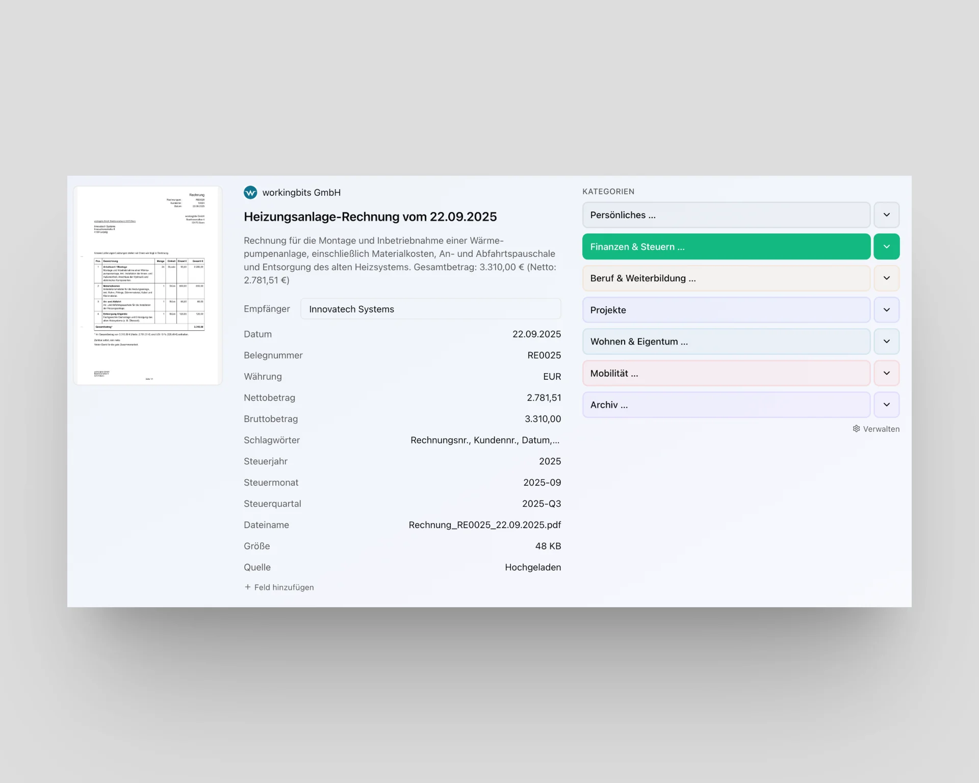 Die KI sortiert, kategorisiert und macht deine Dokumente durchsuchbar. Ab sofort findest du jeden Lieferschein, jede Rechnung und jedes QMS-Dokument in Sekunden.