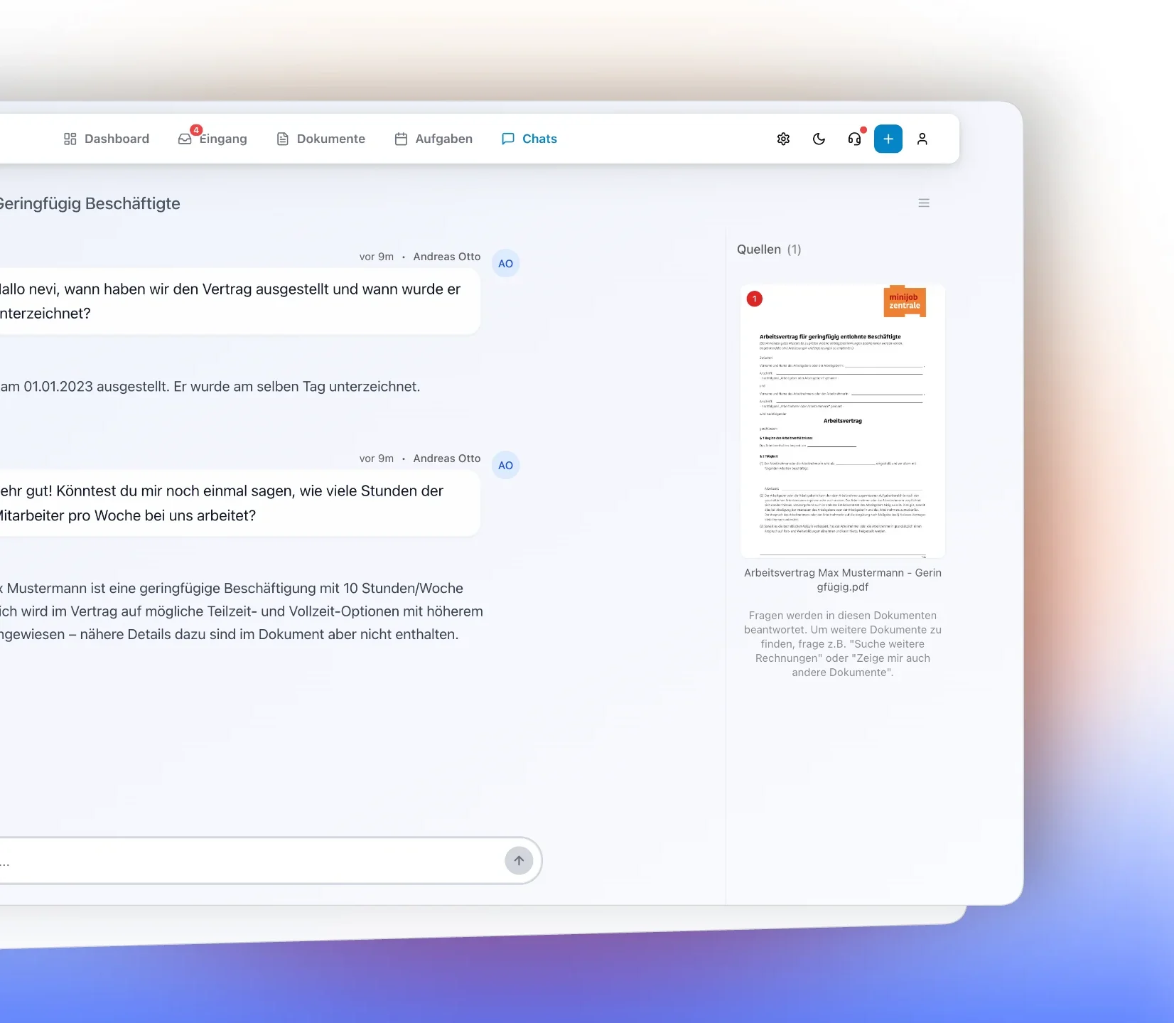 Mit Nevi stellst du einfach eine Frage — zum Beispiel "Wann kam der letzte Bescheid für Mandant Schneider?" oder "Zeig mir alle Belege von Mandant Müller aus Januar" — und bekommst die Antwort direkt aus deinen Dokumenten.